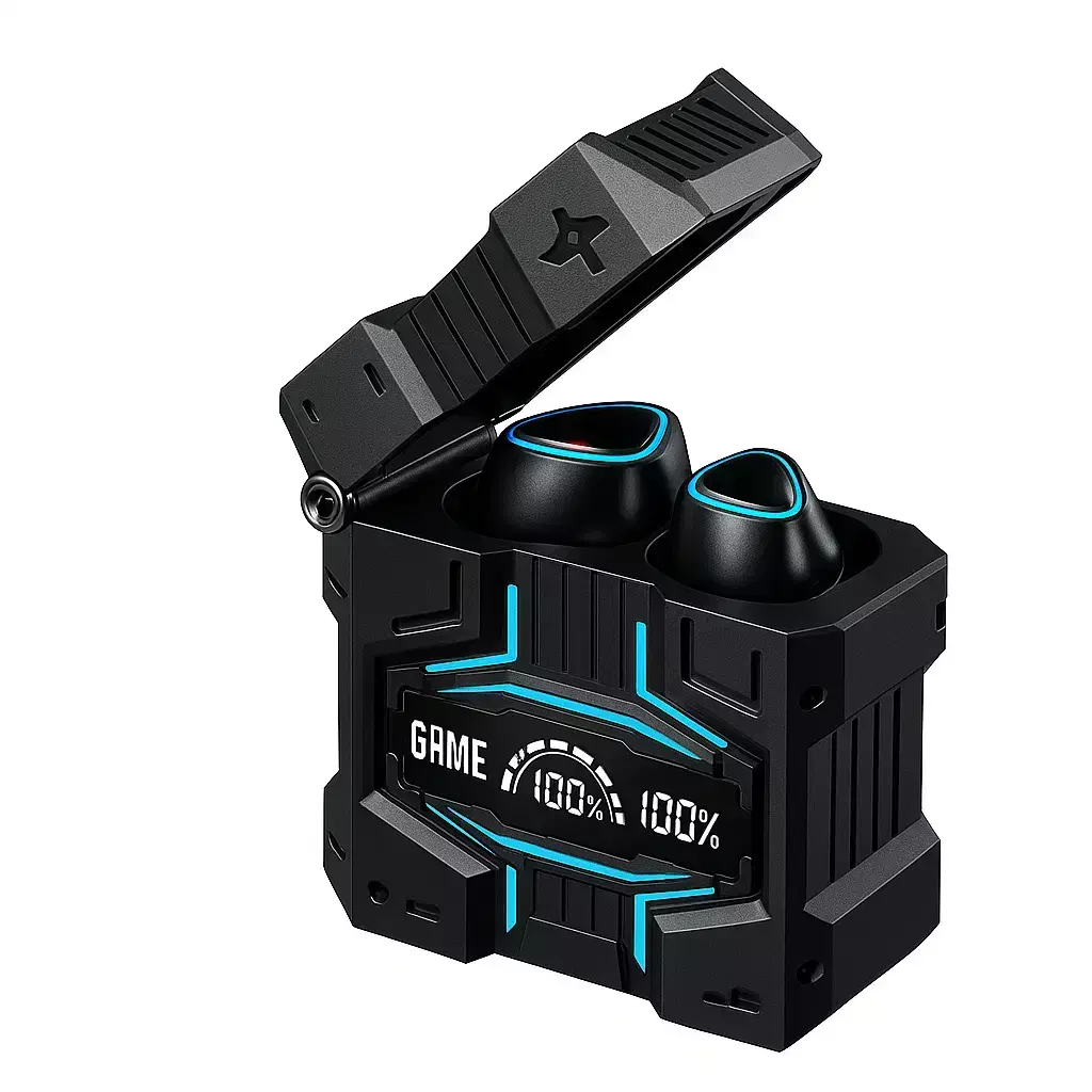 Incluye auriculares bluetooth dúo con baja latencia y estuche gamer con display, más auriculares secundarios para uso diario.